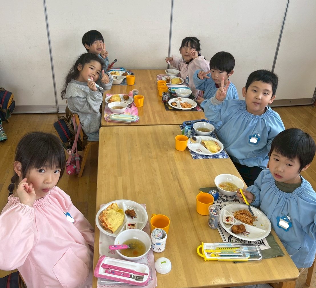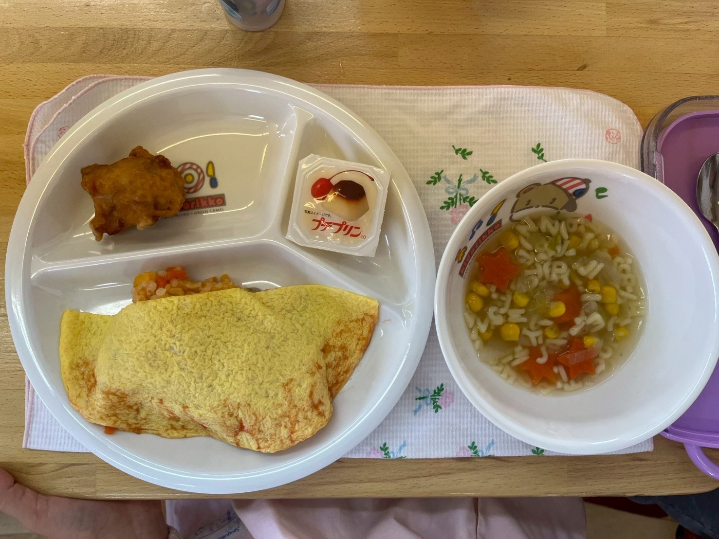 今日はきく組のリクエストメニューでした!☆献立☆・オムライス・から揚げ・プリン・ABCスープ「美味しい~!」「完食できたよ!」と嬉しそうな笑顔がたくさん見られました!