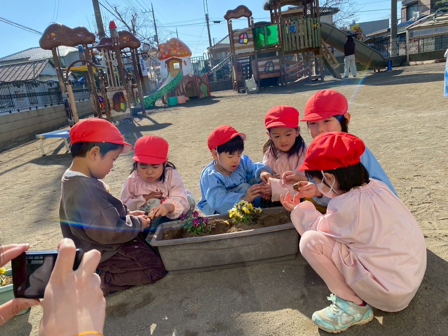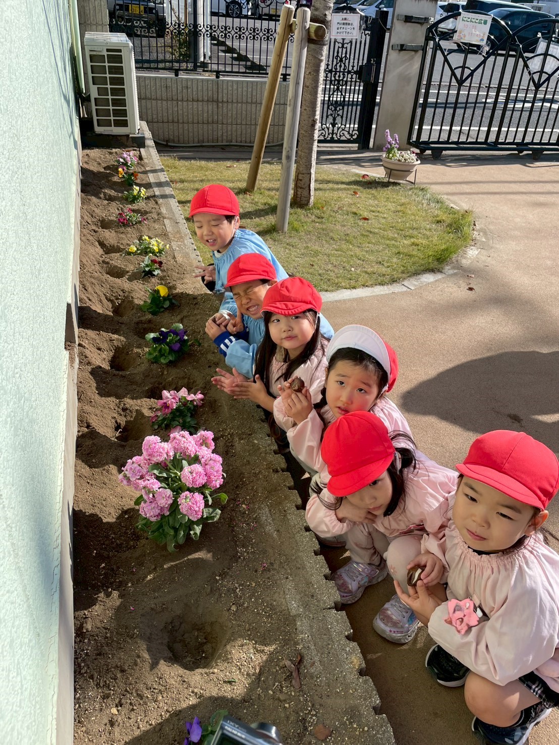 年中組のお友だちで、園庭の花壇やプランターにチューリップの球根を植えました。