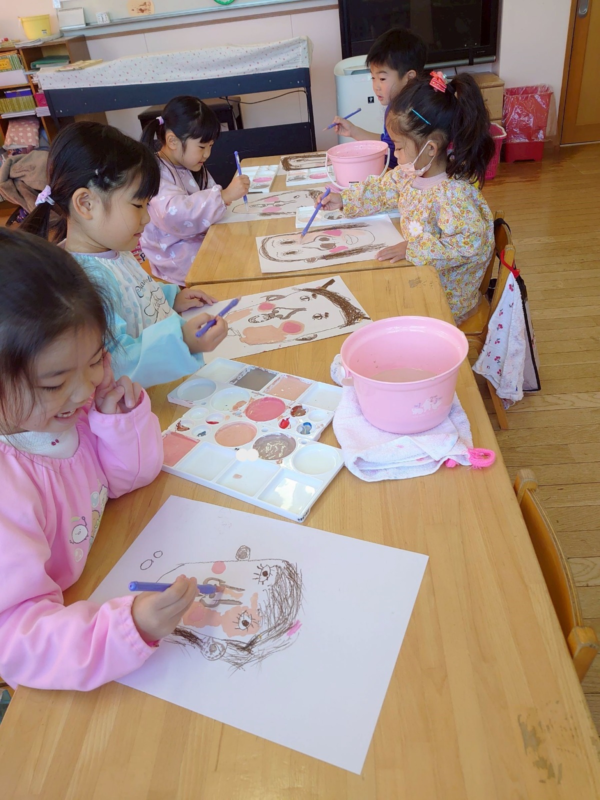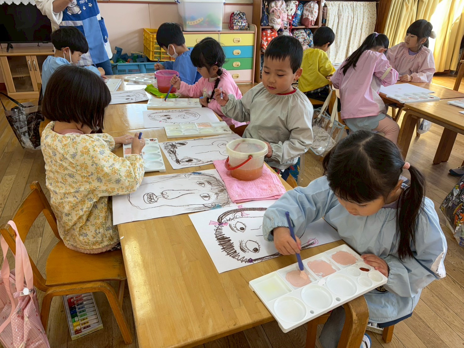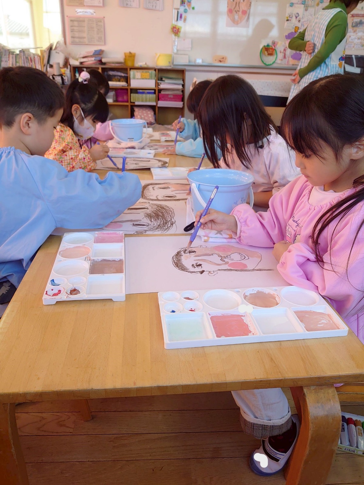 今日は年中組で絵画教室がありました。前回下描きをした自画像に絵の具で色を塗りました。お友だちの顔を見て、同じ肌色でも明るい部分や暗い部分があることを知ったお友だち。真剣な表情で取り組む姿がありました!