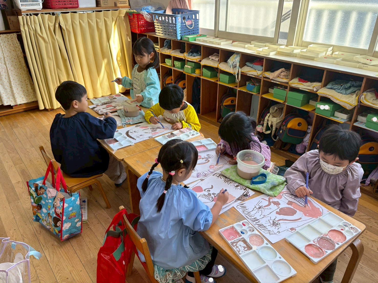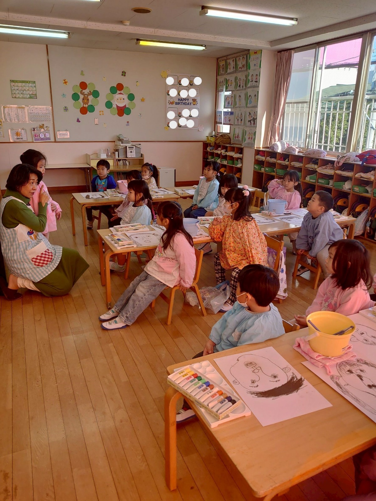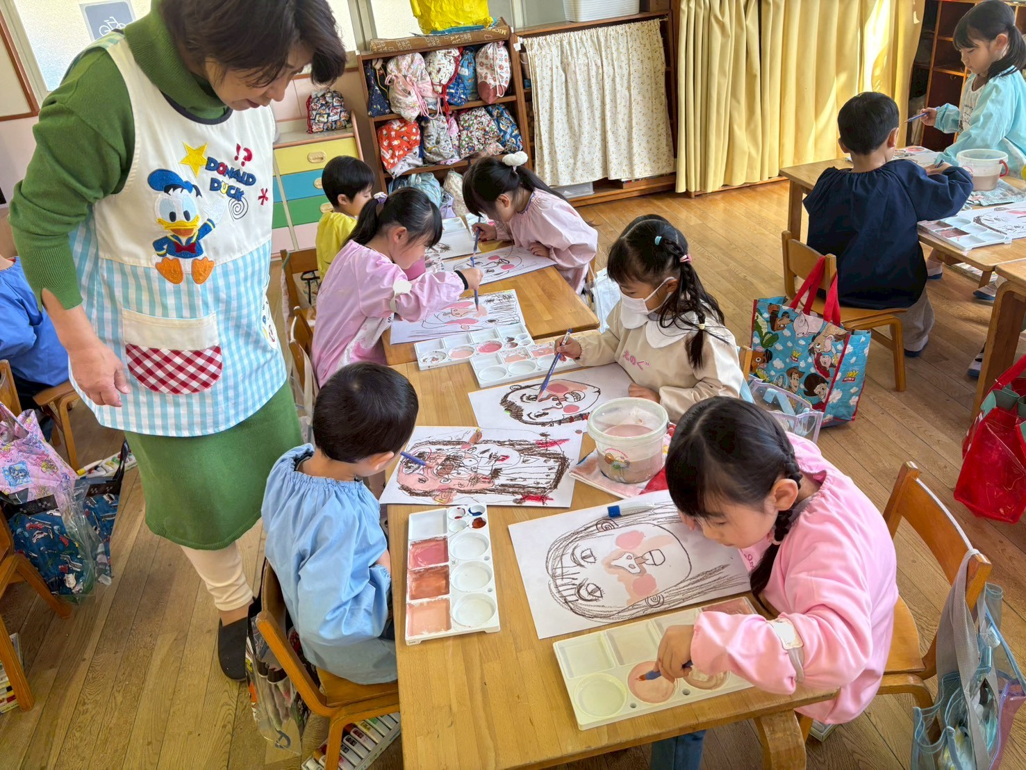 今日は年中組で絵画教室がありました。前回下描きをした自画像に絵の具で色を塗りました。お友だちの顔を見て、同じ肌色でも明るい部分や暗い部分があることを知ったお友だち。真剣な表情で取り組む姿がありました!