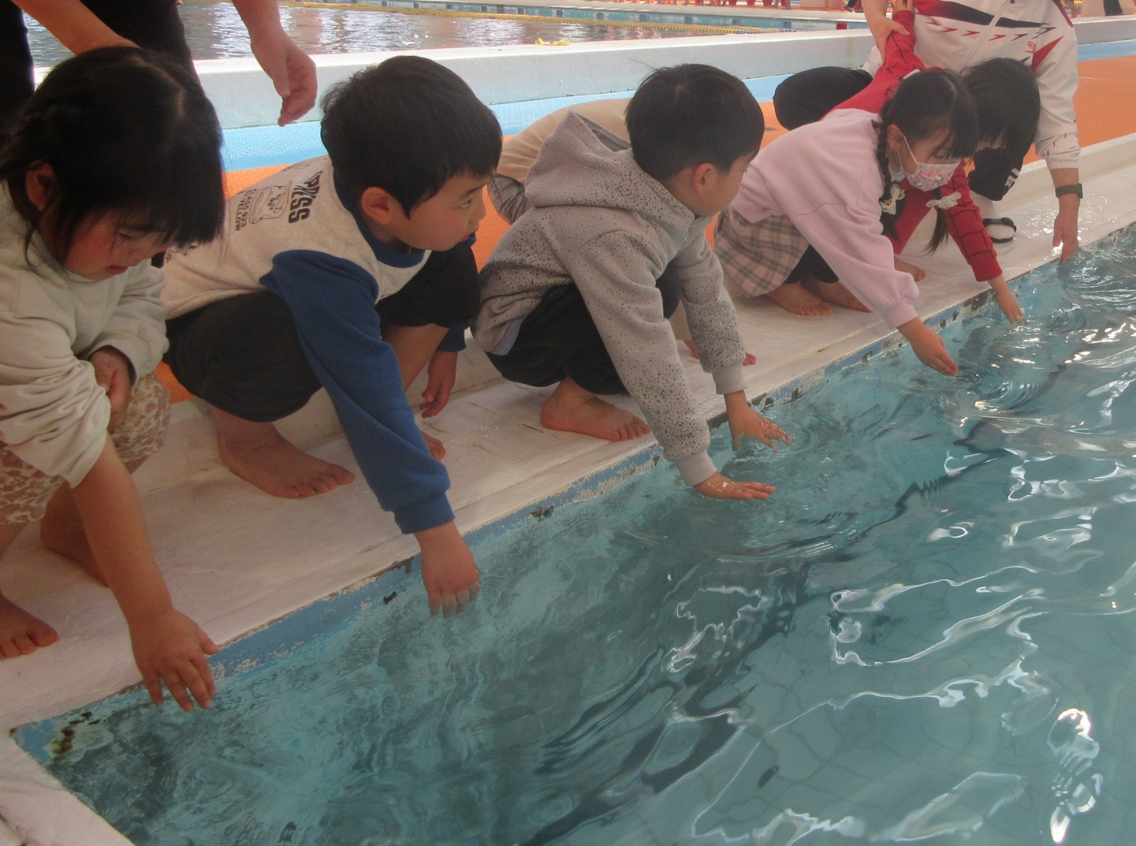 今日は、年中組でスイミング見学に行きました。プールサイドに行きプールの水を触ったり、年長さんが泳いでいる姿を見て「すごいね!」「早くやりたい!」と今から楽しみにする姿が見られていました!