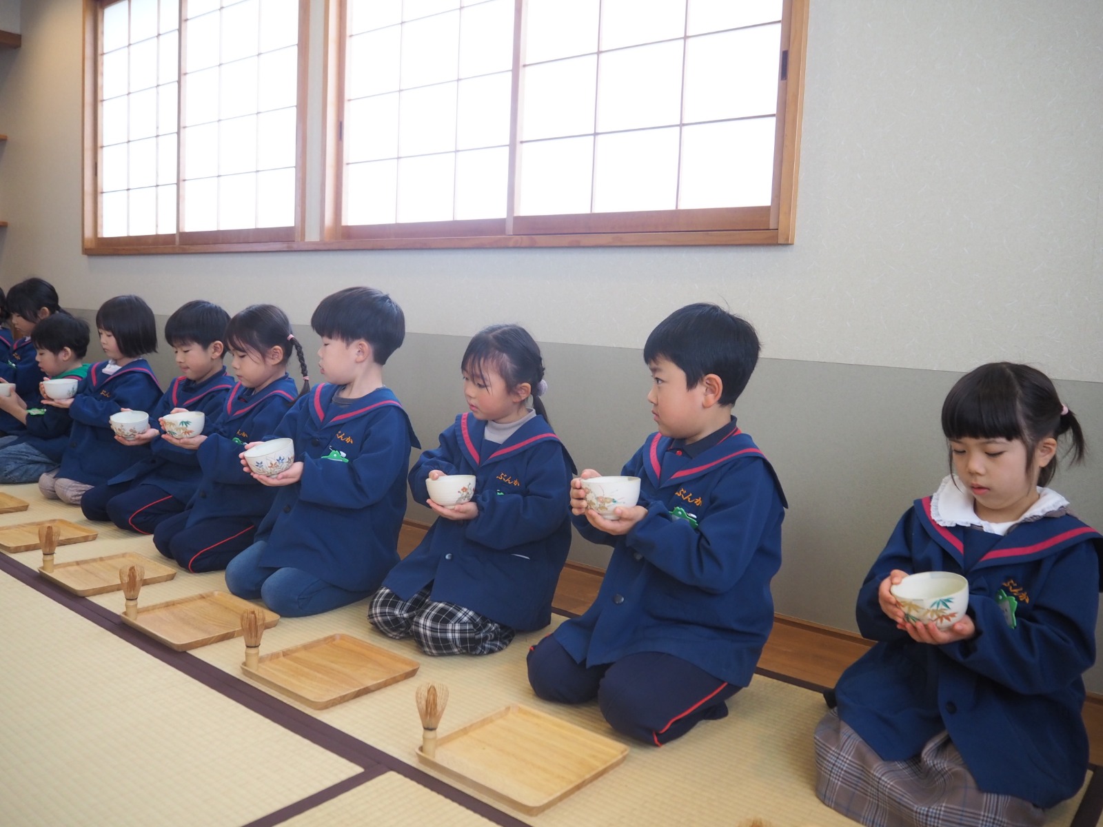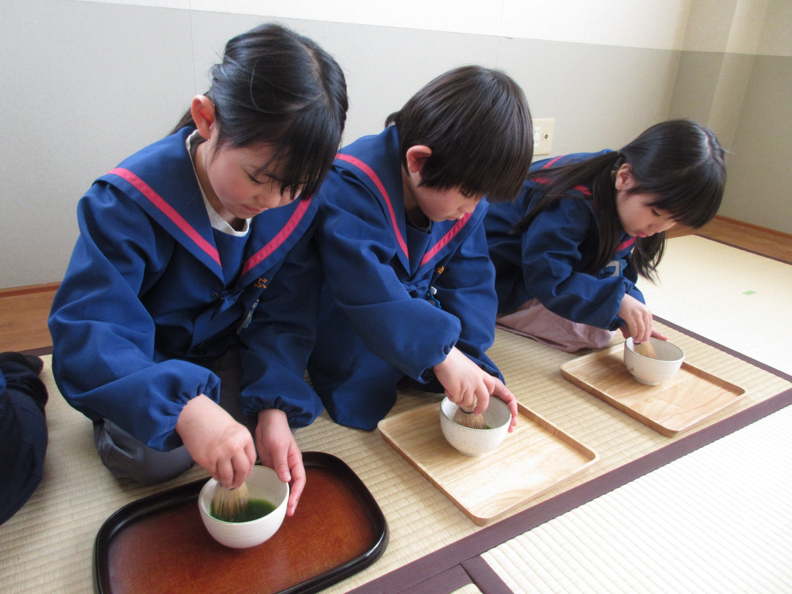 年長組で最後のお茶会を行いました!茶筅を使って上手にお茶を点てることが出来ました。お琴の音色を聞き、素敵なひと時を過ごすことが出来ました♪