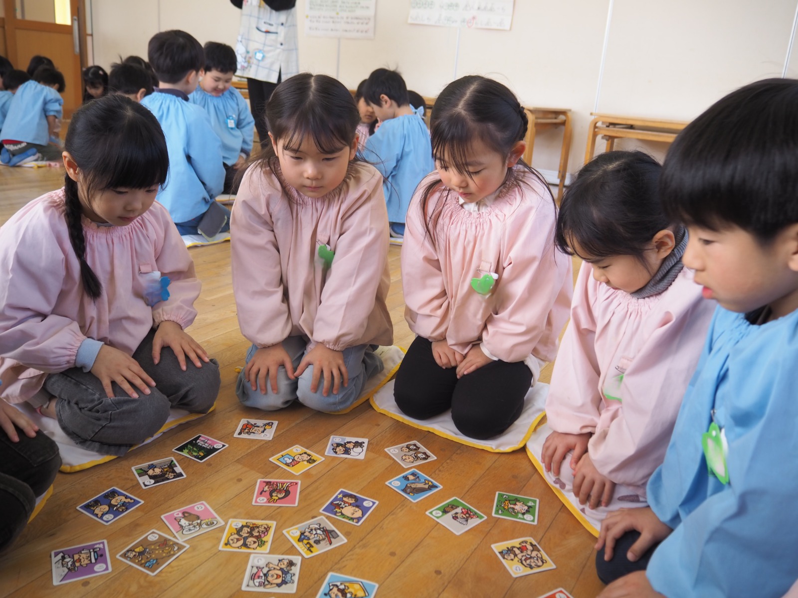 年長組でかるた大会を行いました。目の前の札をじっと見つめている眼差しは真剣そのものでした!お友だちと一緒に楽しむことが出来ました♪