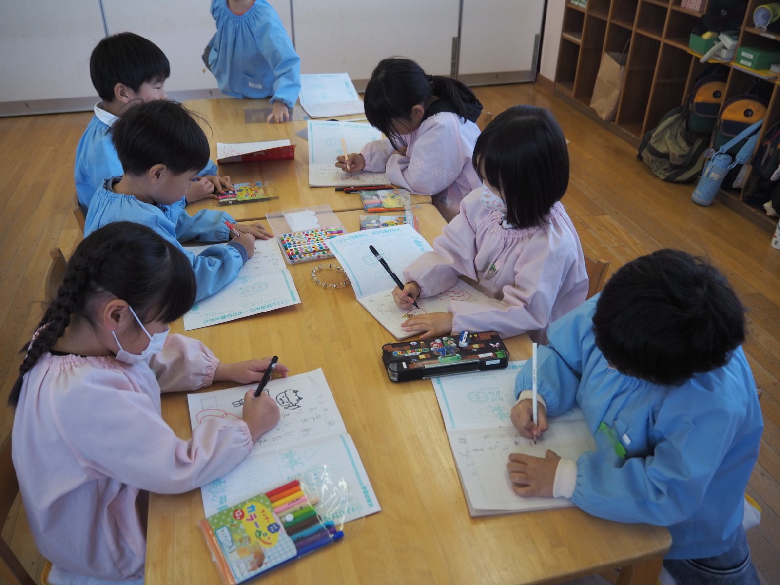今日から年長組で連絡帳が始まりました!国語ノートに一文字ずつ丁寧に書き進める姿がありました。小学生に向けて、少しずつ頑張っていきましょうね♪