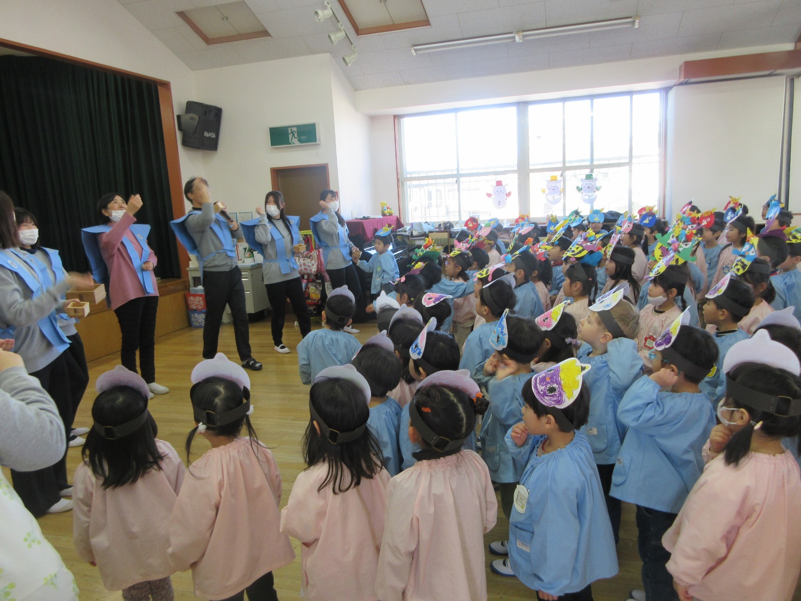 豆まき集会がありました。自分で作った鬼のお面を被って、「鬼は外、福は内~!」と大きな声で赤鬼と青鬼を退治することが出来ました。