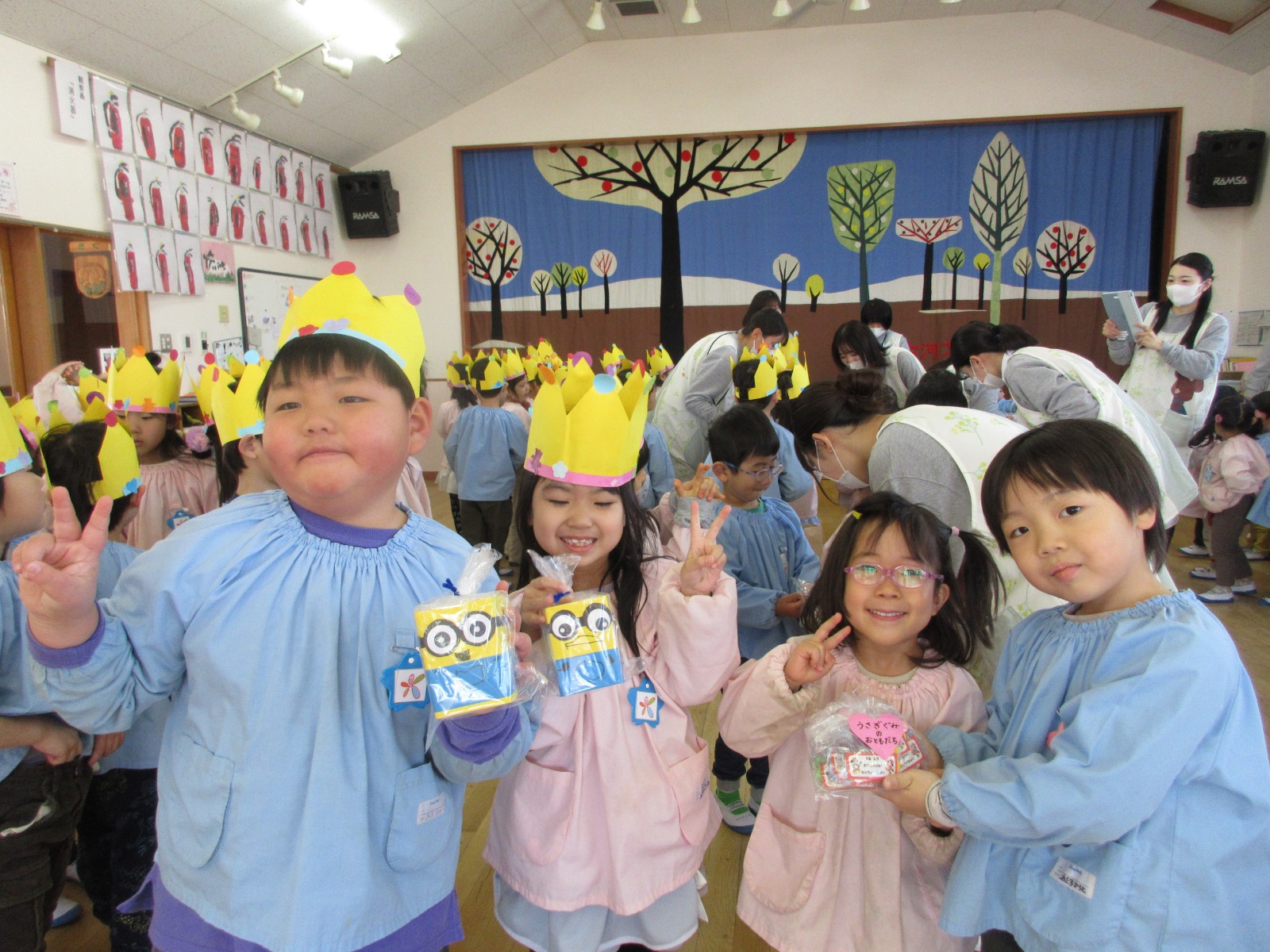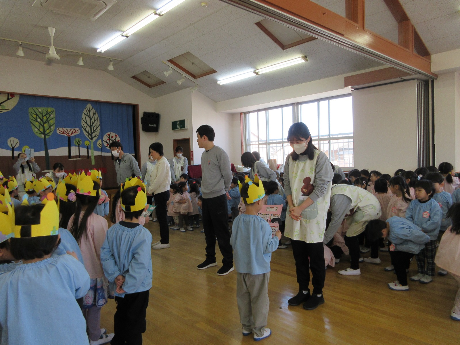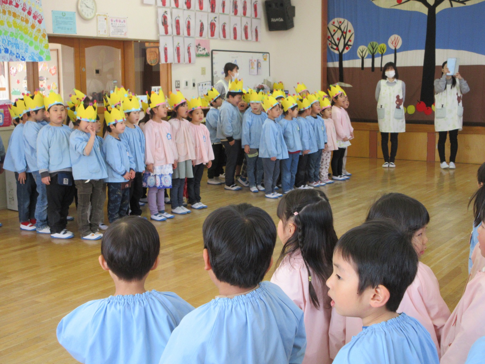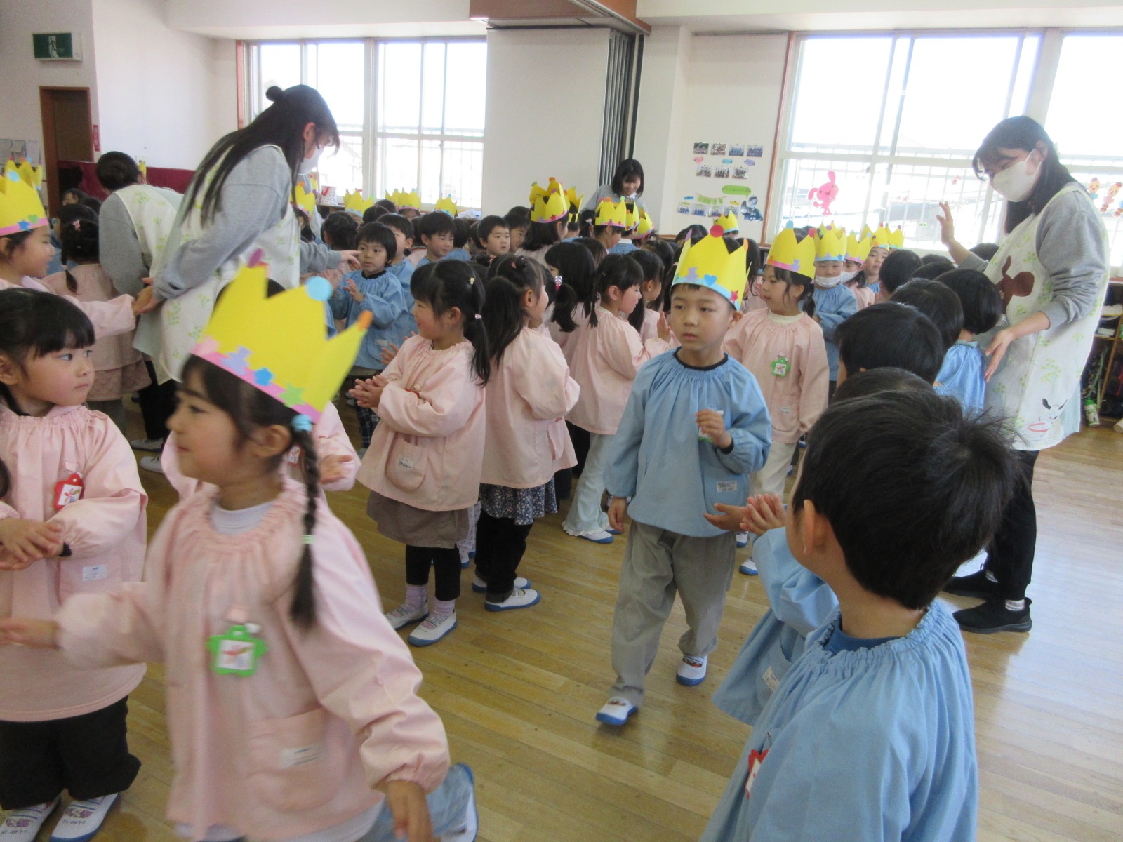 今日は年長さんとのお別れ会がありました。年長さんは年少さんからもらった王冠を被って入場しました!「今までありがとう」の気持ちを込めてお歌や言葉のプレゼントをしました。これからもお兄さん・お姉さんのことを応援しています!がんばってね★