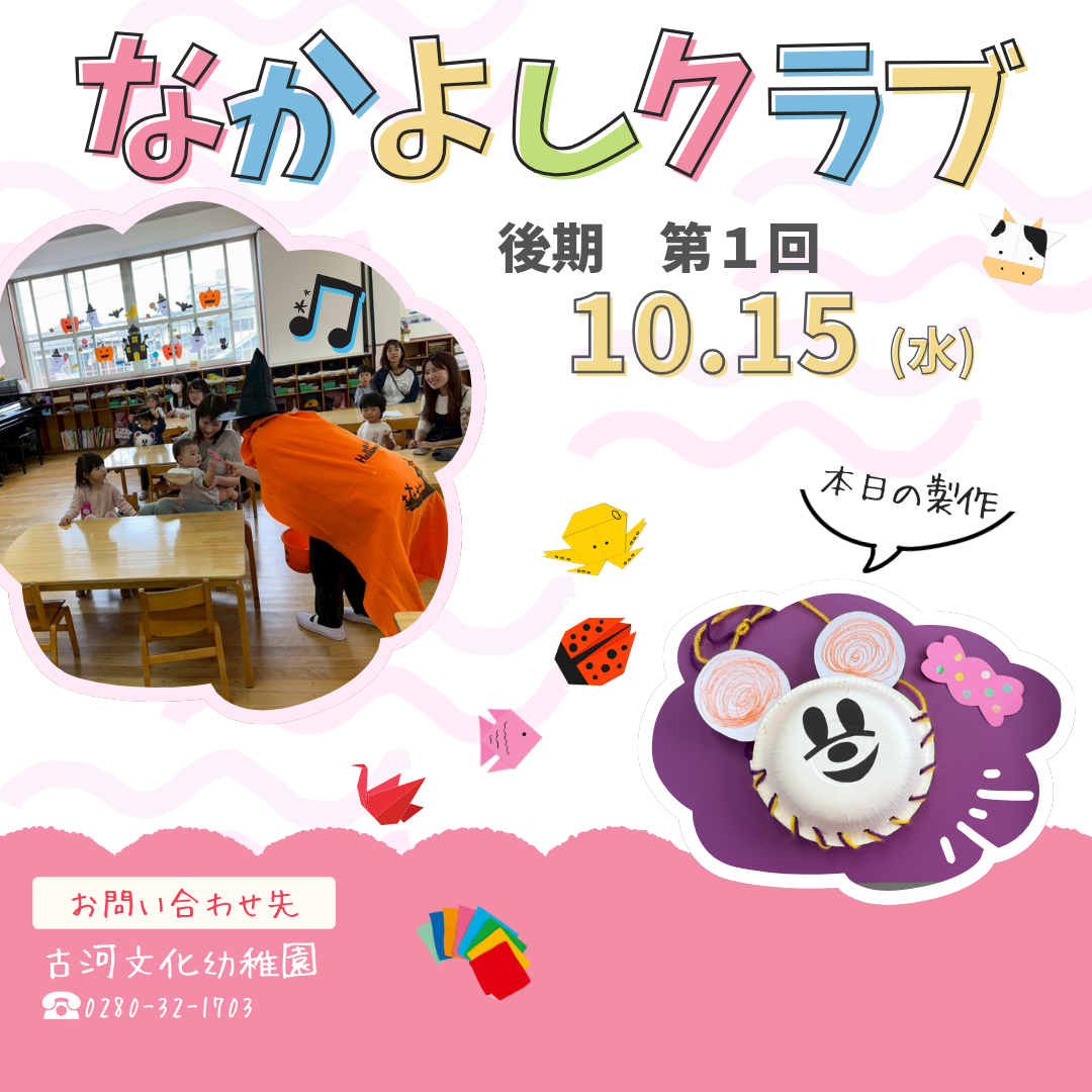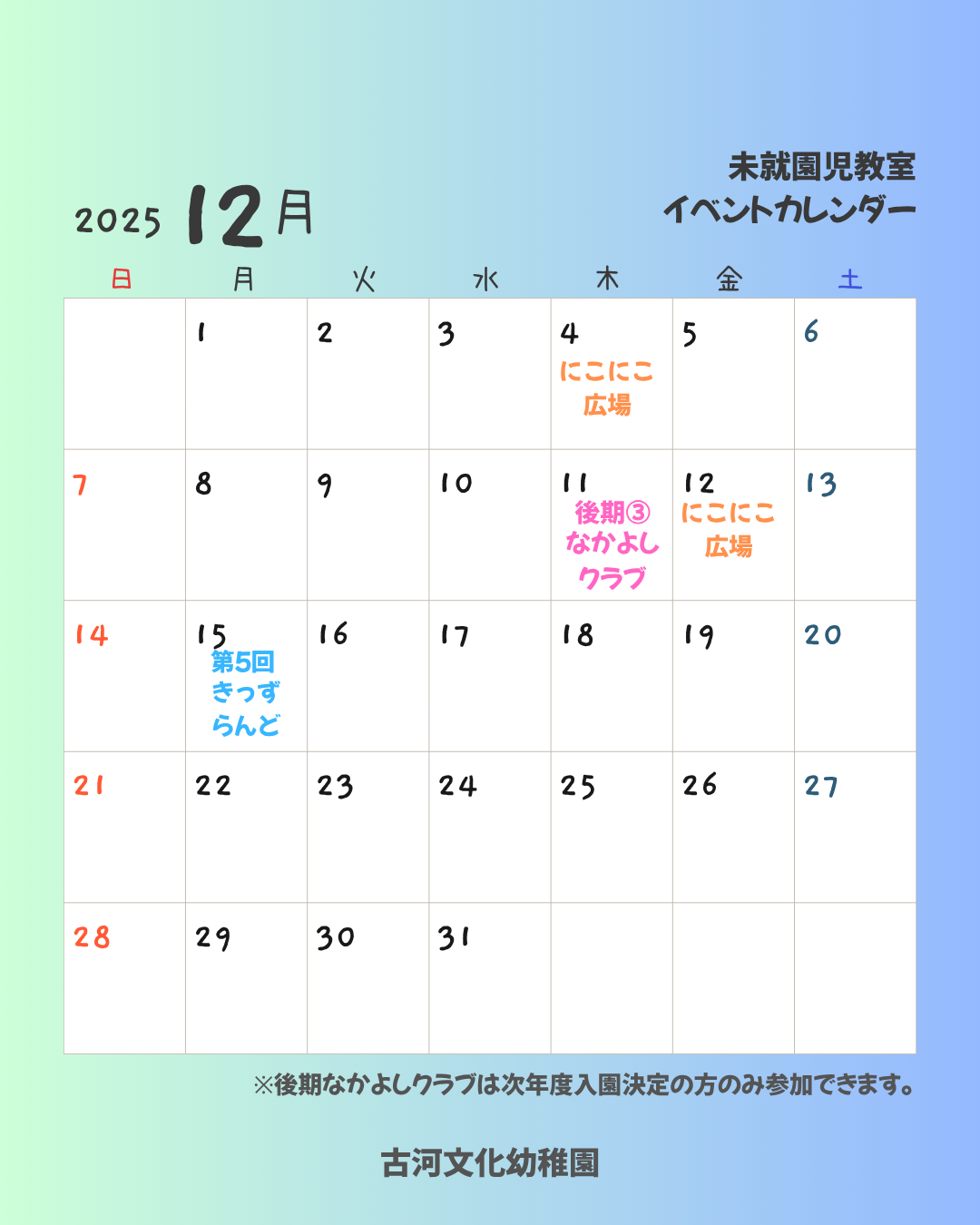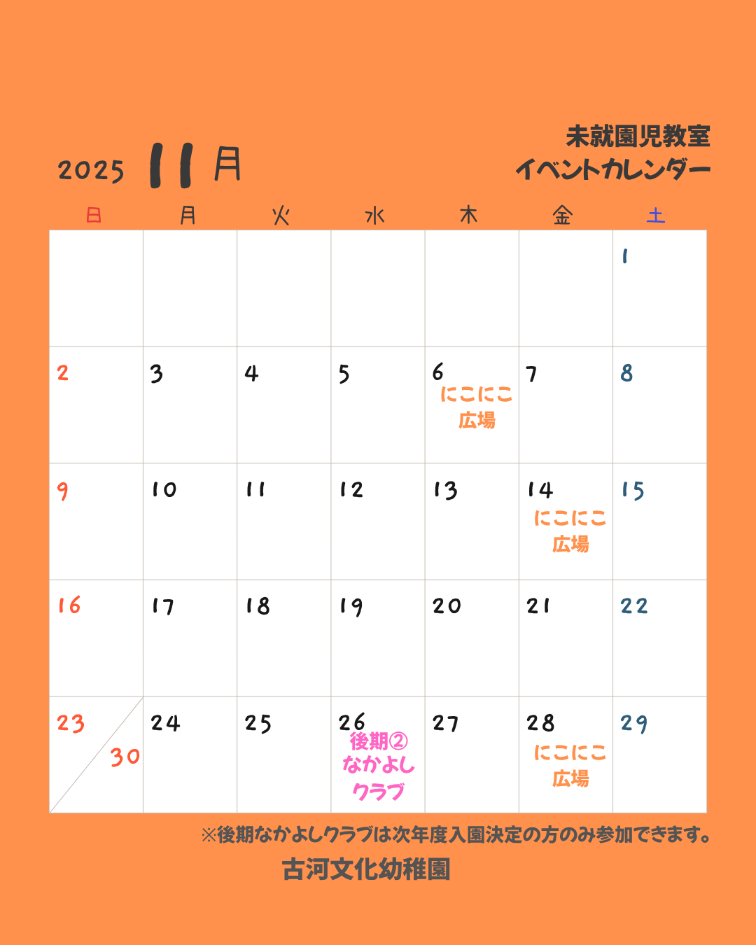 後期『なかよしクラブ』(10~3月)は、本園に令和8年度のご入園受付をされたお子さまを対象に開設致します。4月に少しでもスムーズに集団生活に入れるように、また、親子共々親睦を図ることができますよう、是非ご参加下さい。園庭開放(にこにこ広場)も参加できます。