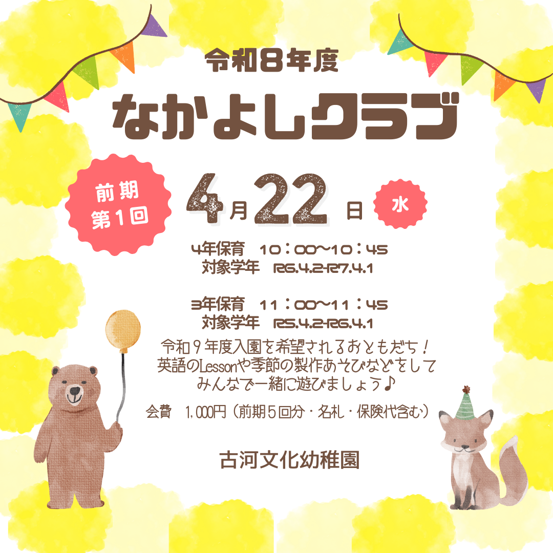 ※にこにこ広場(園庭開放)に一年間参加できます。(同時入会となります。) ※入園に関する情報をなかよしクラブでお知らせします。 ※子育て相談も行っています♪ |