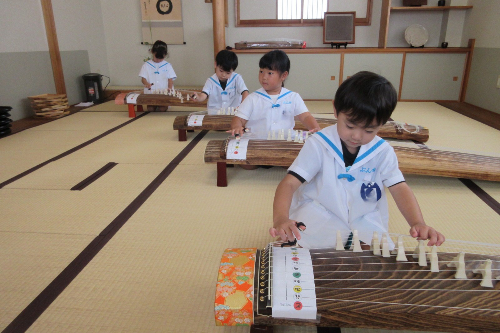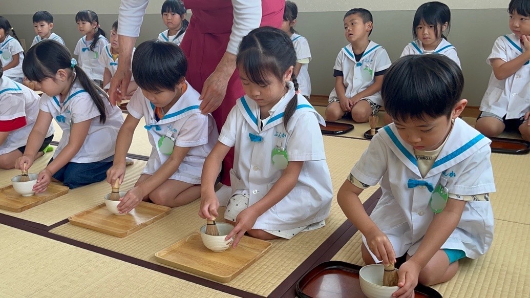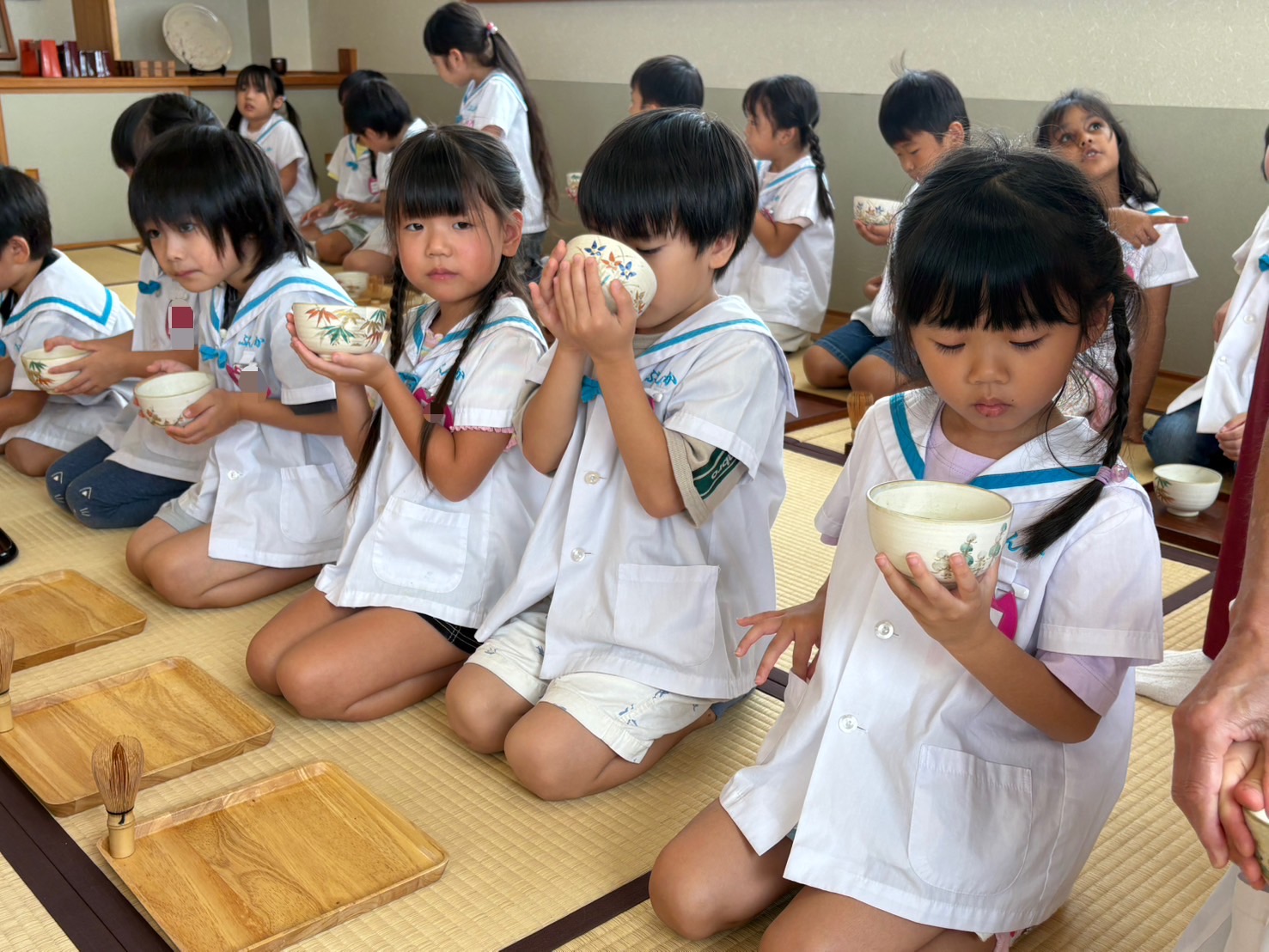 年長組でお茶会を行いました!3回目のお茶会では、自分でお茶をたてることに挑戦しました。牧川先生のお話をよく聞いて、真剣な表情で取り組んでいましたよ!お琴にも触れることができ、初めての経験がたくさんできましたね♪