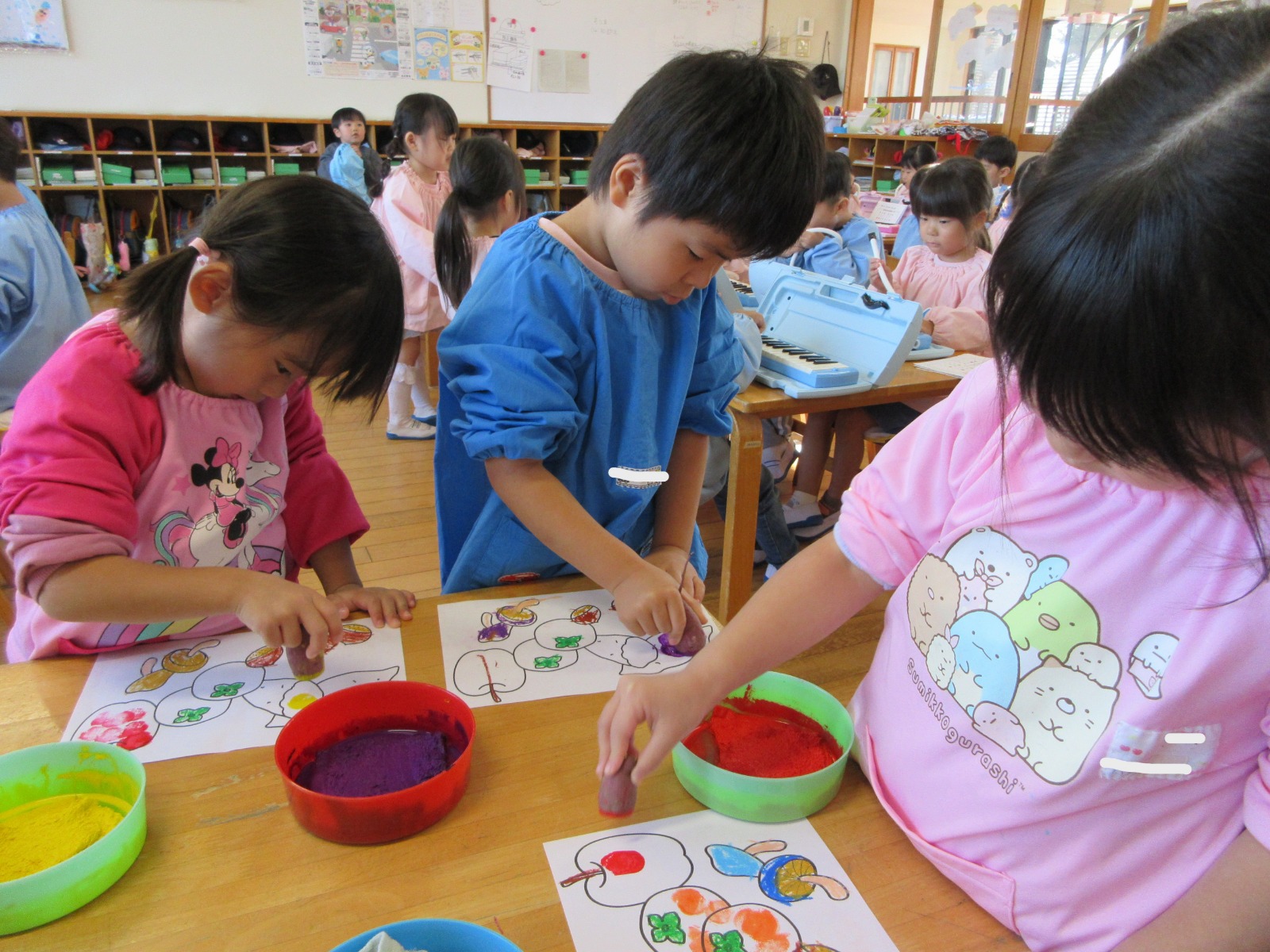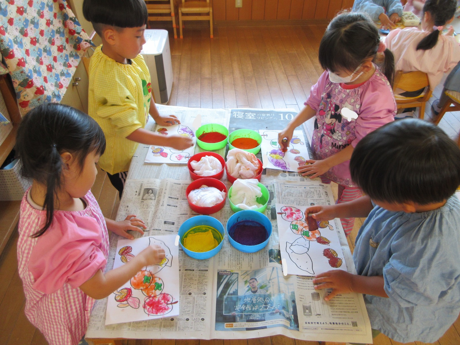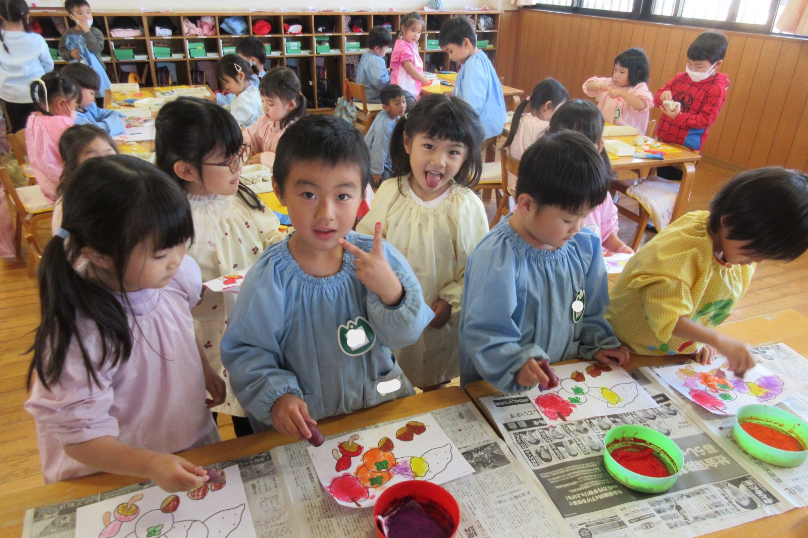 年中組では、さつまいもを使ってスタンプ遊びをしました!絵の具を付けてポンポン...♪「丸い形だー!」「さつまいも大好きー」と楽しそうな会話も聞こえてきましたよ!秋の食べ物に色とりどりのスタンプを楽しむことができました♪
