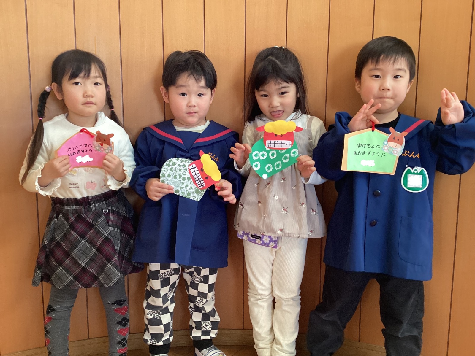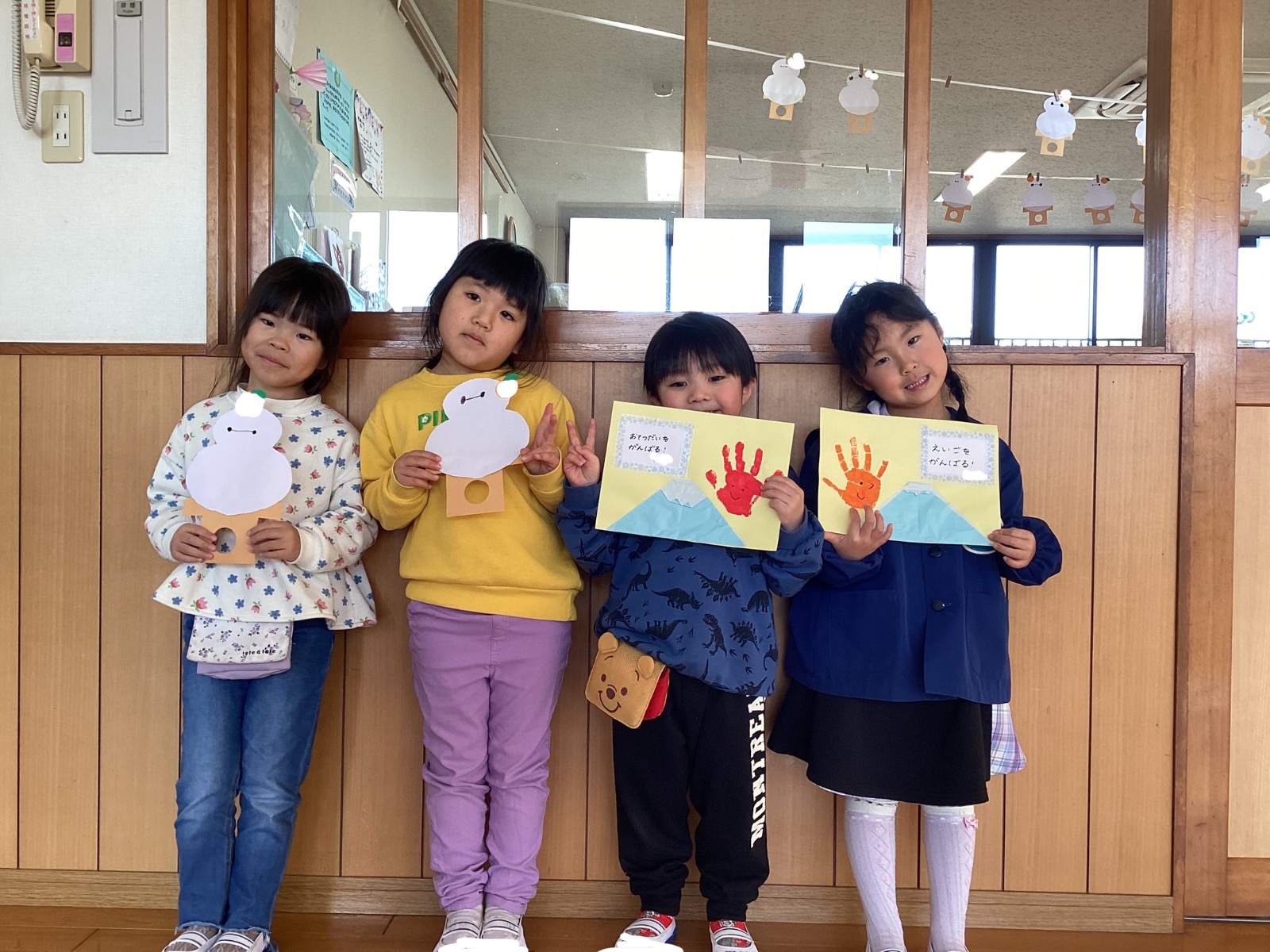 年中組の1月クラス製作を紹介します。はと『うまだるまの福笑い』かもめ『富士山と日の出』つばめ『ししまいと絵馬』お正月について興味津々なお友だち!!1月らしい、素敵な作品ができましたね♪