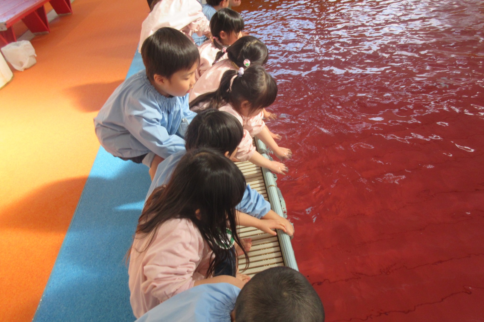 楽しみにしていたお友だち!見学の時間になり…ドキドキワクワク♪スイミングバスに初めて乗り、お水にもちょっぴり触れてみたりと楽しく見学をすることができました☆