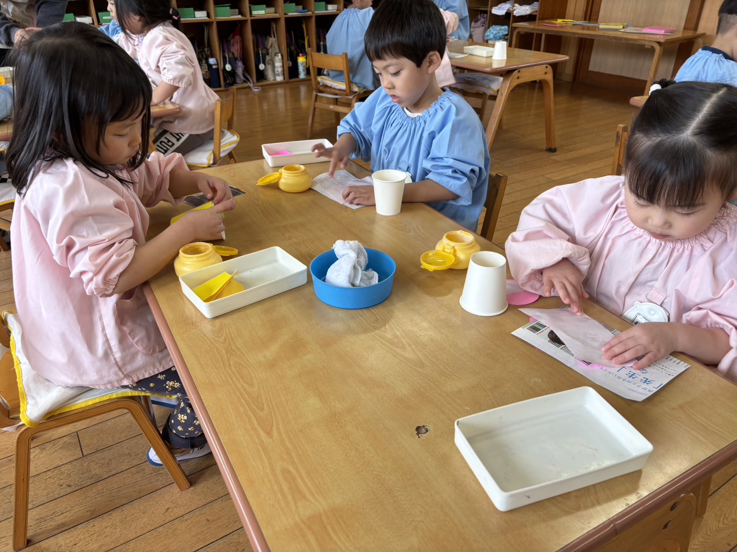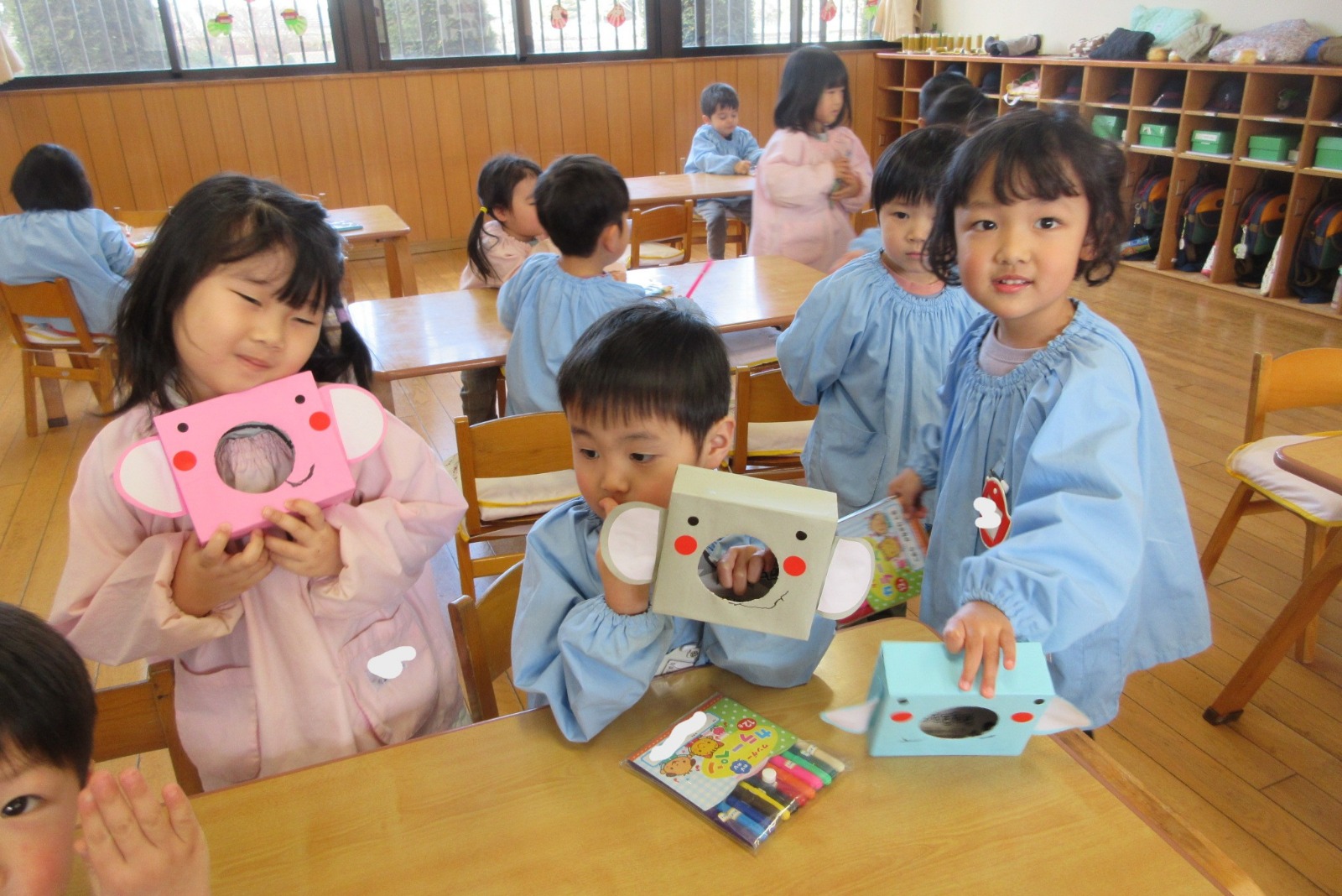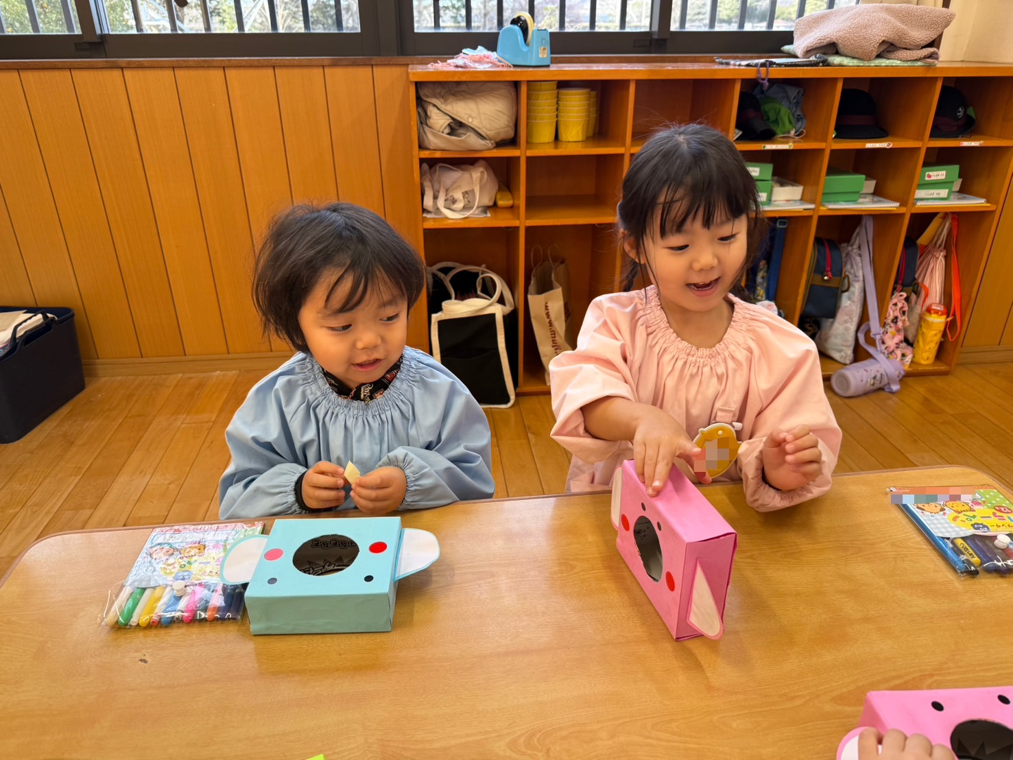 お菓子の箱からとびきり可愛いゾウさんのカメラに変身していく様子にお友だちからも「かわいい~!」と完成に期待を膨らませる姿が見られます!参観際には完成した作品がご覧になれるのでぜひ楽しみにしていて下さいね!