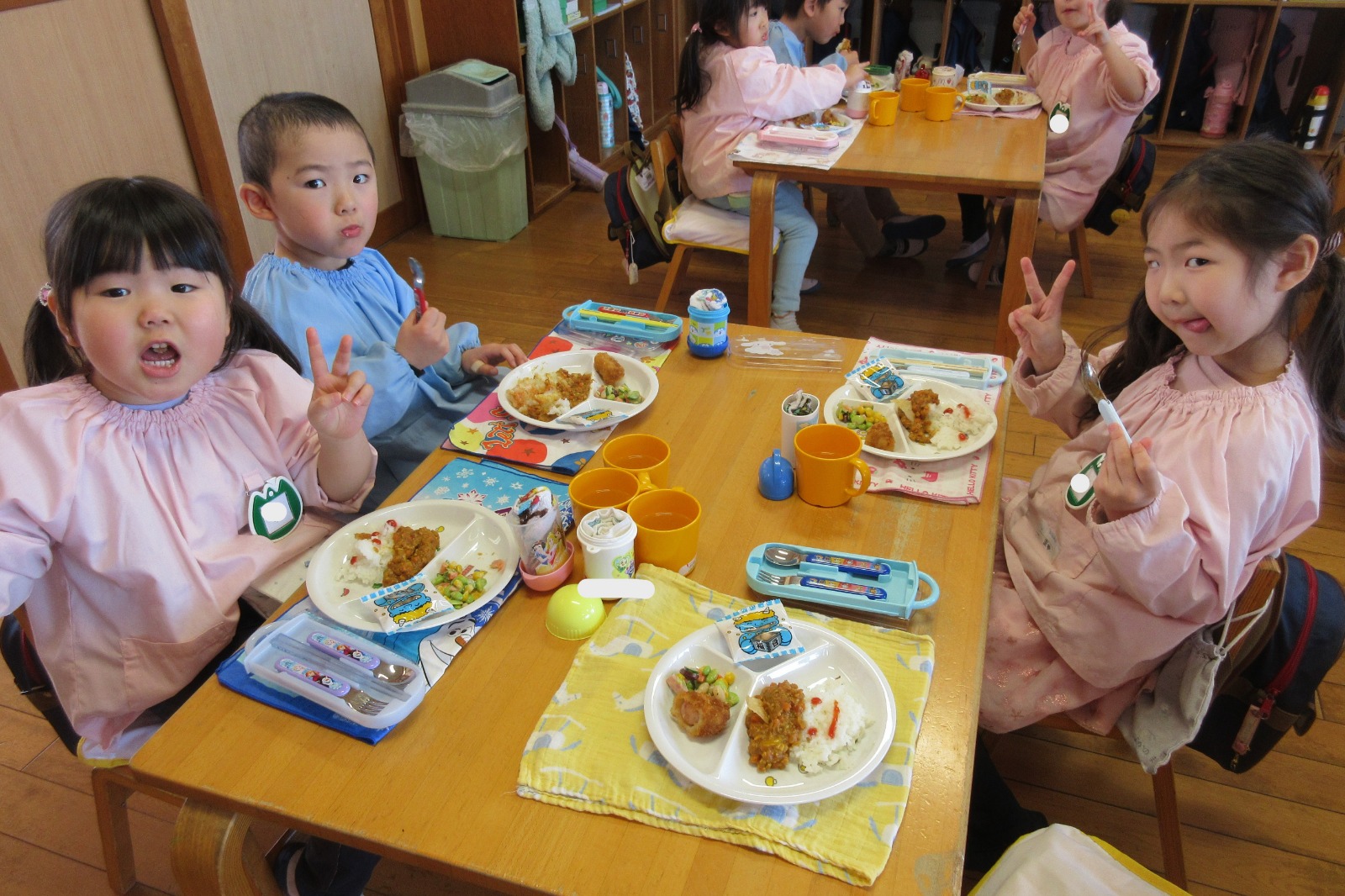 給食の時間になると豆まきでの楽しかったことや鬼さんにびっくりしたことなど、楽しくお話しながら、モリモリ食べる姿が見られましたよ!