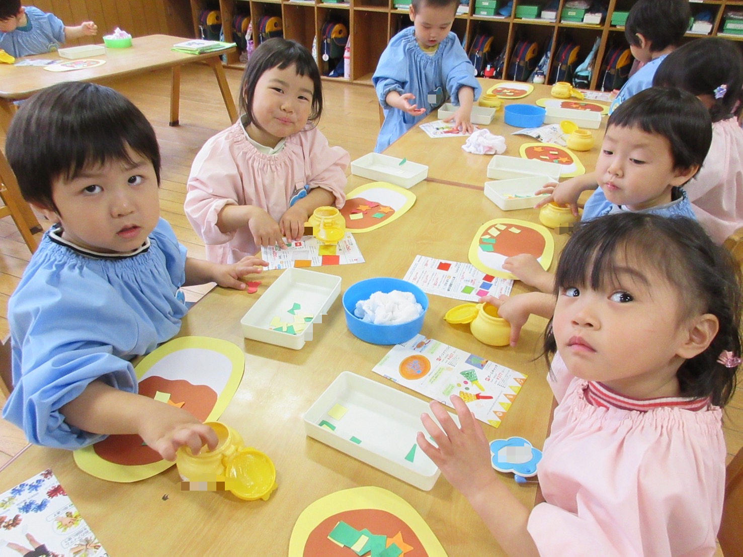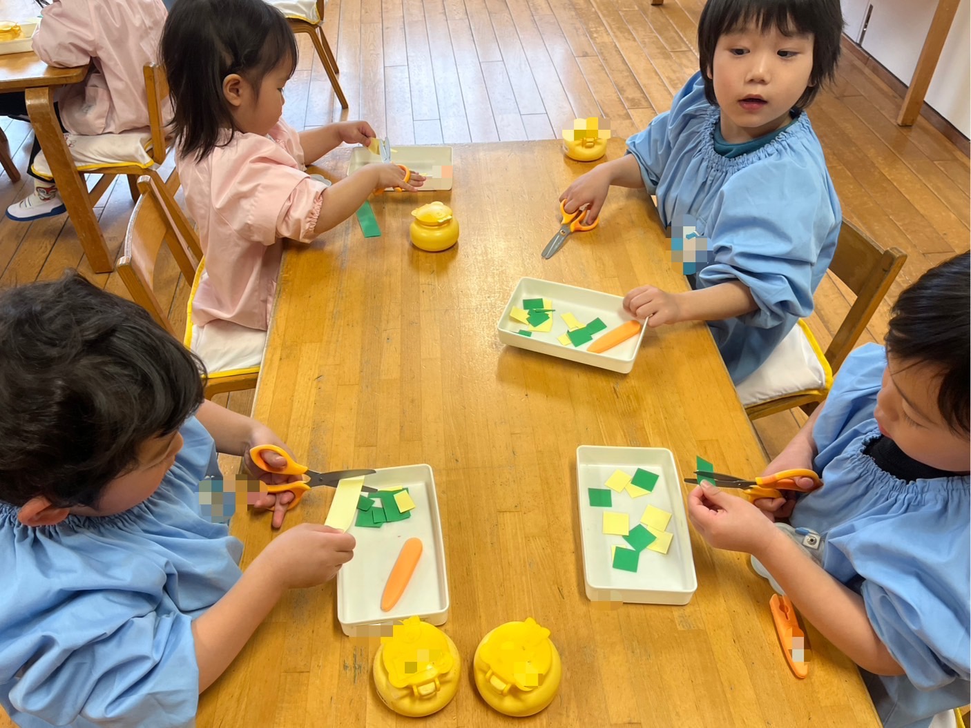 今日はハサミを使ってカレーの製作をしました!上手にハサミを使い、具材をちょきちょき切ったり、「グーパー」と言いながら楽しく製作することができました!お星さまのにんじんやタコさんウインナーなども入れて、美味しいカレーを作ることができましたよ♩