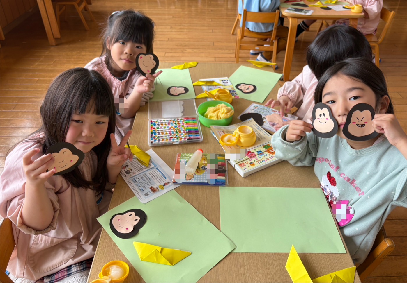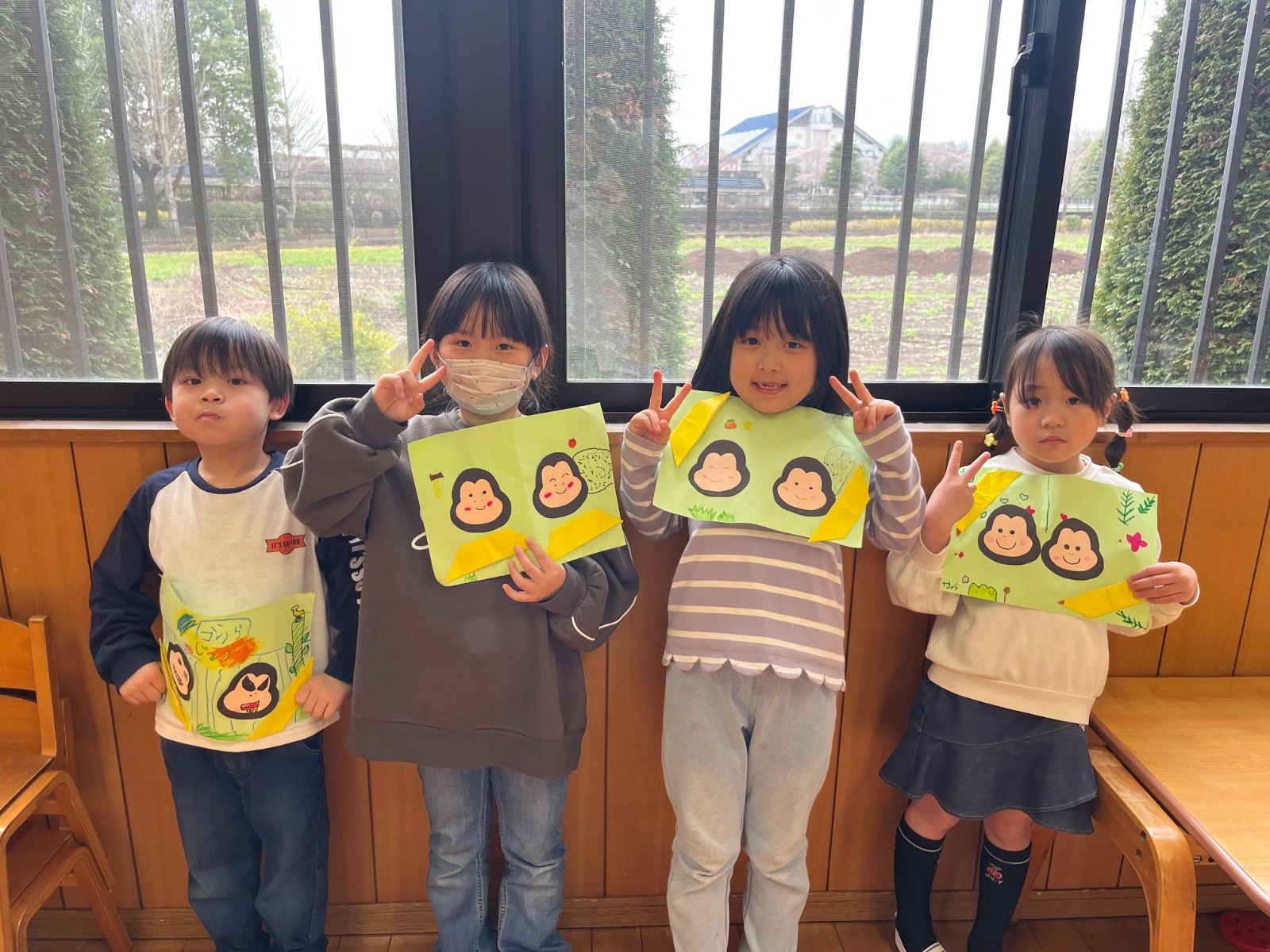 今日の預かり保育はごりらの製作を行いました!鼻の穴を面白おかしく描いたり、ほっぺで可愛くしたりと個性が溢れていました!折り紙でバナナも作って上手に完成しましたよ♪英語ではトンネルをくぐってカードをゲットするゲームを楽しく行いました!